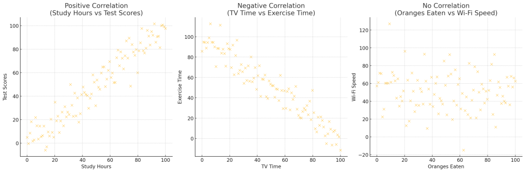 - No Correlation: Sometimes, two things are just not related at all. (e.g., the number of oranges eaten and your Wi-Fi speed)
